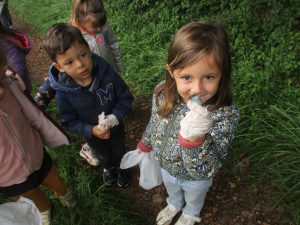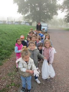 La classe de maternelle a affronté la grisaille et l’humidité du matin pour partir à la chasse aux déchets avec enthousiasme.